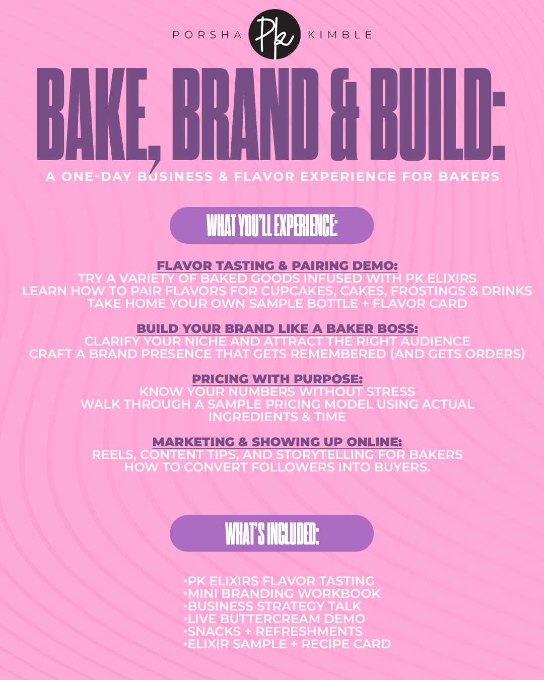 Join Porsha Kimble, the creator of PK Elixirs and founder of Beyond the Frosting, for a hands-on workshop where cake meets strategy. This one-day event is packed with flavor, knowledge, and business-building energy, perfect for bakers, treat makers, and dessert Entrepreneurs ready to scale.
